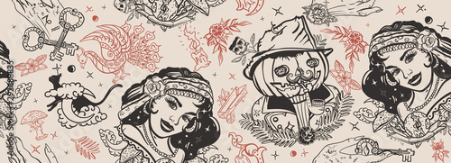 Halloween Seamless Pattern Old School Tattoo Retro Gothic Fairy Tale Background Witch Woman Gypsy Crystal Ball Jack O Lantern Occult Hands And Black Cats Traditional Vintage Tattooing Style Stock Vector Adobe